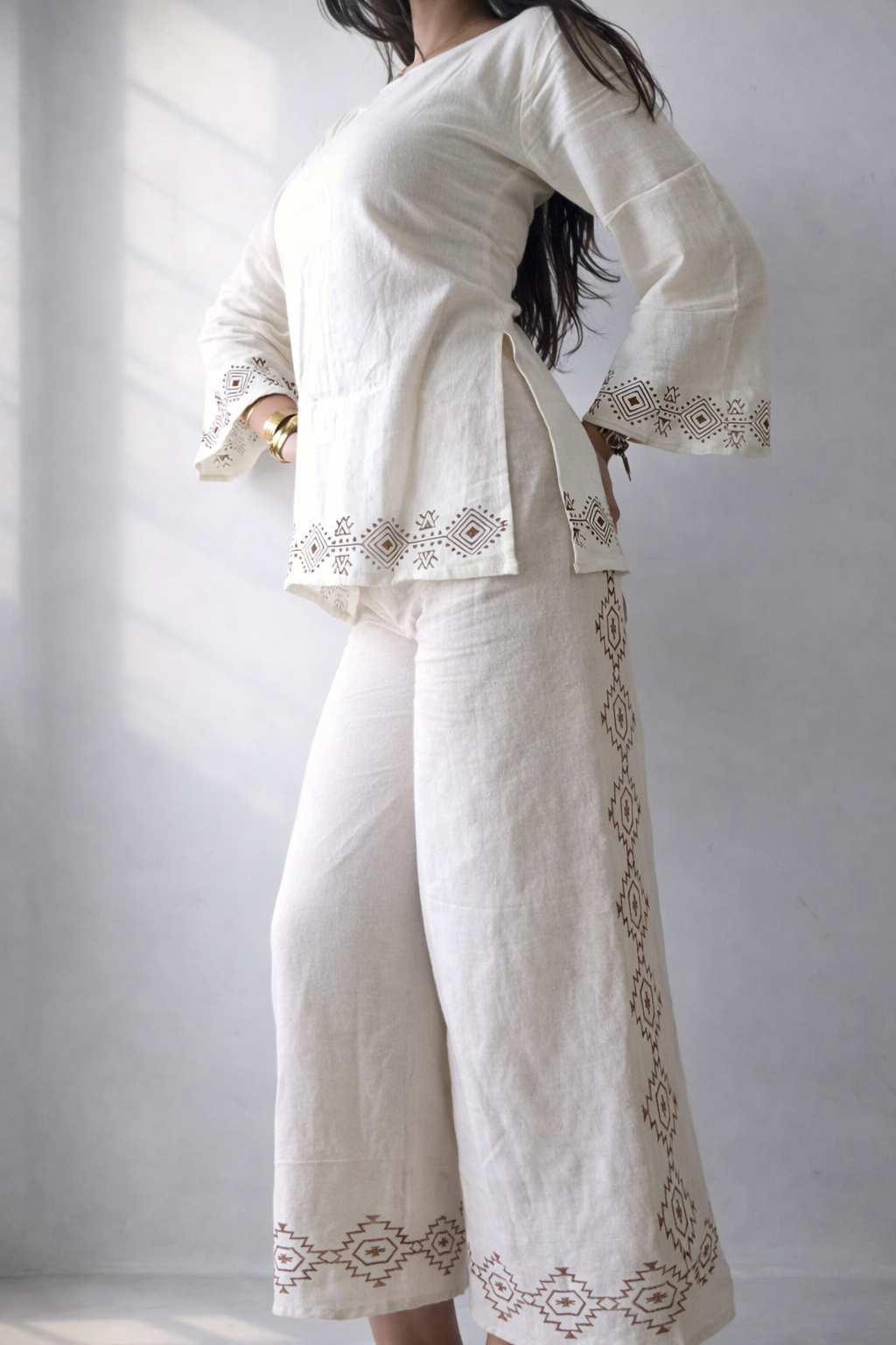 Crafted in breathable pure organic cotton, this beige corset back handblock kurti features a relaxed-fit kurti with lace-up back detailing and flared palazzo pants highlighted with traditional block prints. Lightweight, sustainable, and effortlessly elegant—ideal for everyday wear and conscious wardrobes.