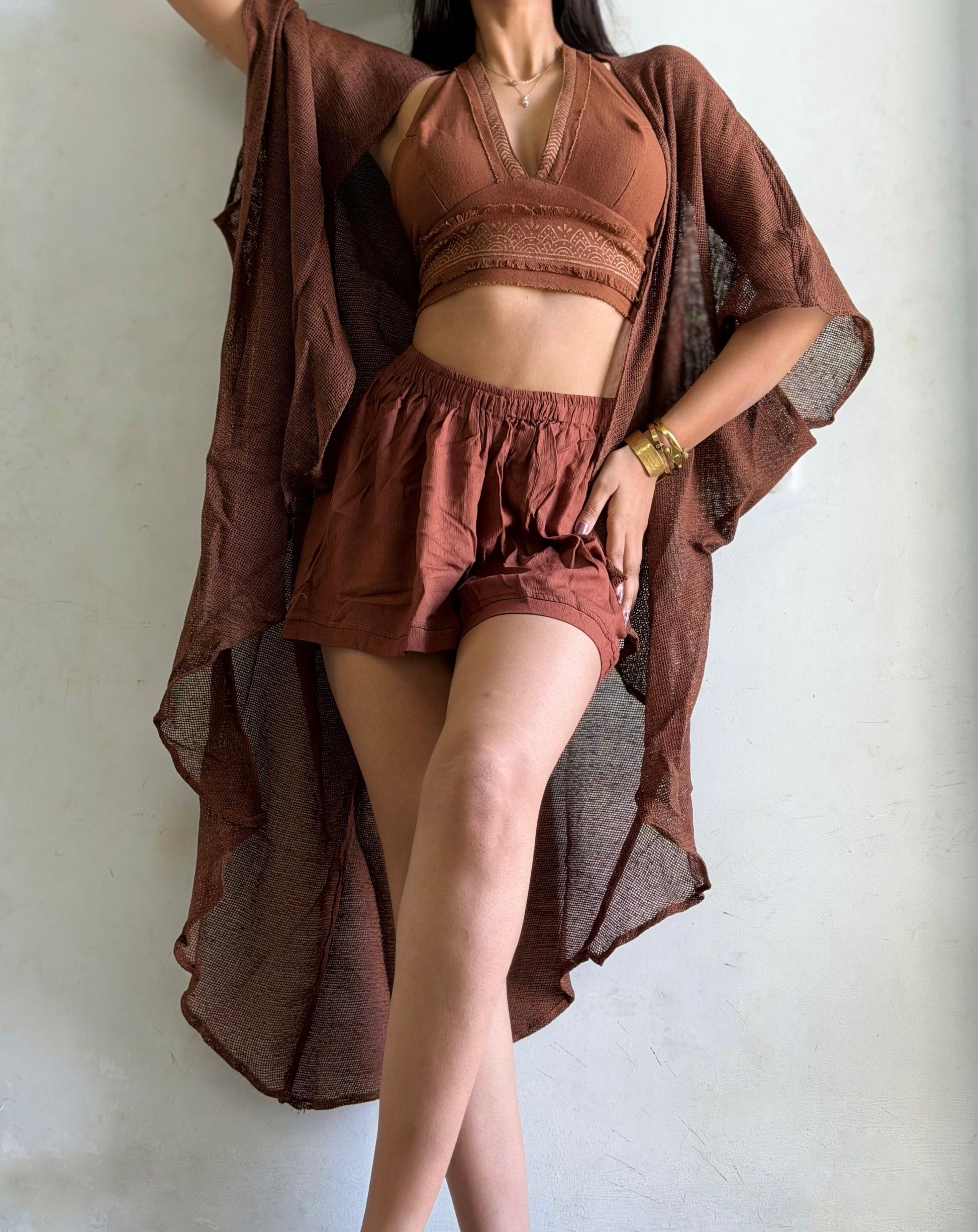 Terra Muse 3-Piece Co-Ord Set – Halter Top, Crinkled Shorts & Flow Kimono- brown colour